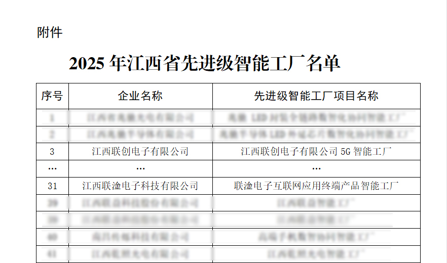 近日,江西省工业和信息化厅正式公布2025年江西省“先进级智能工厂”名单,186家企业入选。其中AG百家乐-官网,、江西联淦电子科技有限公司2家联创电子系企业名列榜单。这标志着公司在智能制造领域的创新成果再次获得政府权威认可。